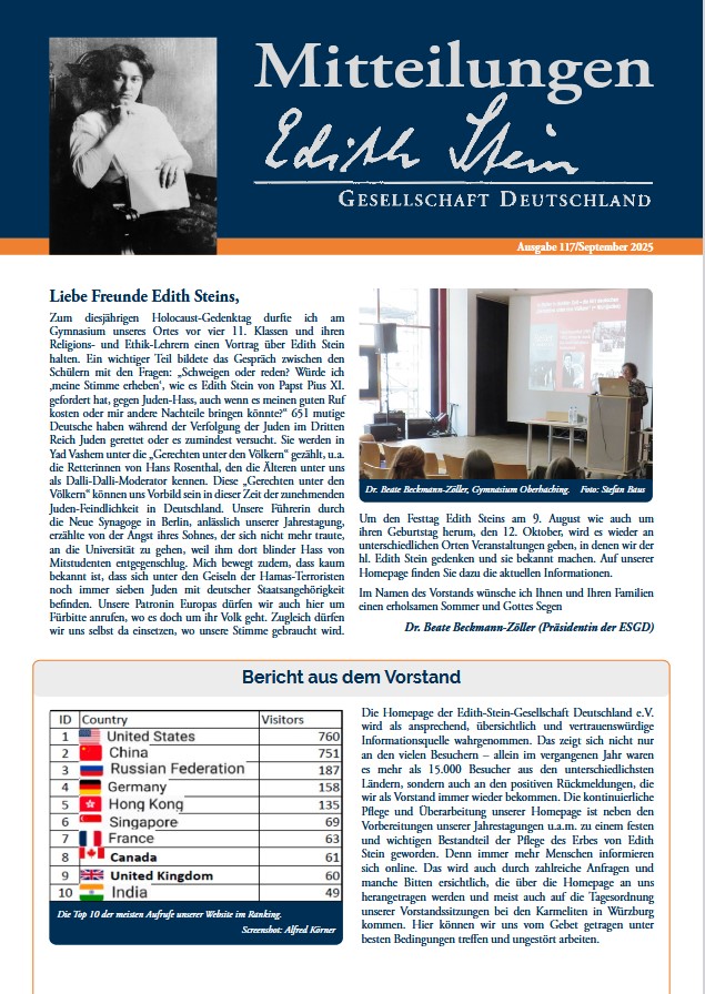 wie jedes Jahr im Advent erwarten wir die Ankunft des Friedensfürsten. Die Engel verkünden dann zur Geburt Jesu Christi den Frieden auf Erden. Edith Stein fragt 1931 zurecht: „Wo ist der Friede auf Erden? Friede auf Erden denen, die guten Willens sind! Aber nicht alle sind guten Willens. Darum musste ja der Sohn des Ewigen Vaters aus der Herrlichkeit des Himmels herabsteigen, weil das Geheimnis der Bosheit die Erde in Nacht gehüllt hat.“ (Das Weihnachtsgeheimnis, ESGA 19, 4f.) Der Friede hat viele Dimensionen: die politische zwischen Ländern, die soziale in der Familie und im Staat und die persönliche im eigenen Herzen. Noch kein politischer Friede, aber ein Waffenstillstand wurde im Heiligen Land erreicht. Für uns Freunde Edith Steins, die als Jüdin Ausgrenzung und später Deportation und Ermordung aus staatlich verordnetem Rassen-Hass erlitten hat, gab es im Oktober eine frohe Botschaft: die 20 noch lebenden jüdischen Geiseln wurden frei gelassen, die über zwei Jahre der Folter der Hamas-Terroristen ausgesetzt waren, darunter vier, die sowohl israelische als auch deutsche Staatsbürger sind. In der Ukraine sehnen sich die Menschen weiter nach Frieden, wie auch im Sudan, im Kongo, im Jemen, in Nigeria und weiteren Ländern. Trotz all dieser Nachrichten und dem „Geheimnis der Bosheit“ dürfen wir uns den eigenen Frieden im Herzen neu von Christus schenken lassen. Edith Stein fand diesen Frieden in der Freundschaft mit Christus. Es hat „Jahre gedauert, bis ich den Ort gefunden habe, wo Ruhe und Frieden ist für alle unruhigen Herzen“, schreibt Edith Stein am 13.09.1925 an Fritz Kaufmann (ESGA 2, Br. 45).