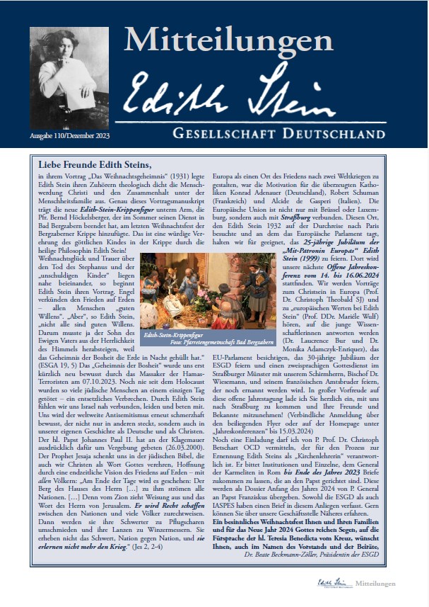 In ihrem Vortrag „Das Weihnachtsgeheimnis“ (1931) legte Edith Stein ihren Zuhörern theologisch dicht die Menschwerdung Christi und den Zusammenhalt unter der Menschheitsfamilie aus. Genau dieses Vortragsmanuskript trägt die neue Edith-Stein-Krippenfigur unterm Arm, die Pfr. Bernd Höckelsberger, der im Sommer seinen Dienst in Bad Bergzabern beendet hat, am letzten Weihnachtsfest der Bergzaberner Krippe hin zufügte. Das...weiterlesen